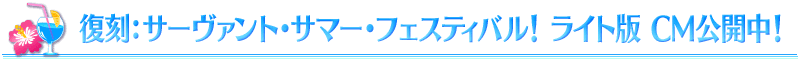 「Fate/Grand Order」公式サイト内トップページおよびギャラリーにて、期間限定イベント「復刻:サーヴァント・サマー・フェスティバル! ライト版」のTVCMを公開しております。