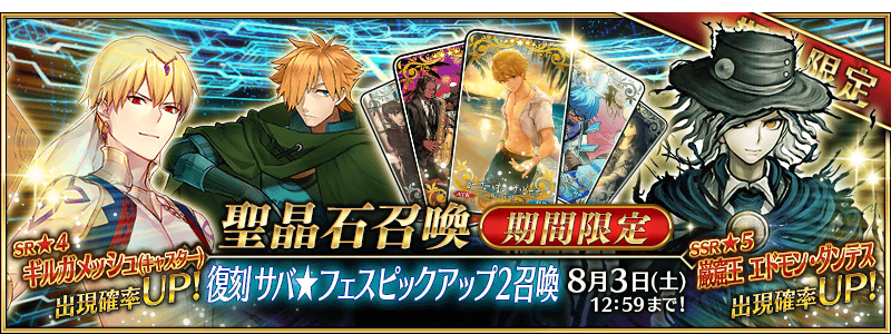 期間限定イベント「復刻:サーヴァント・サマー・フェスティバル! ライト版」にて「★5(SSR)巌窟王 エドモン・ダンテス」「★4(SR)ギルガメッシュ(キャスター)」「★3(R)ロビンフッド」の霊衣開放権が登場!