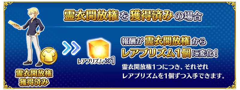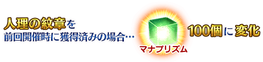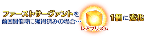 ・前回開催時に「聖杯」を獲得している場合、本イベントでは「聖杯」に代わり「伝承結晶」がクリア報酬となります。 ・前回開催時に「霊衣開放権」を獲得している場合、本イベントの対象クエストで「霊衣開放権」に代わりレアプリズムを獲得できます。 ・前回開催時に「コマンドコード」を獲得している場合、本イベントの対象クエストで「コマンドコード」の代わりにレアプリズムまたはマナプリズムを獲得できます。