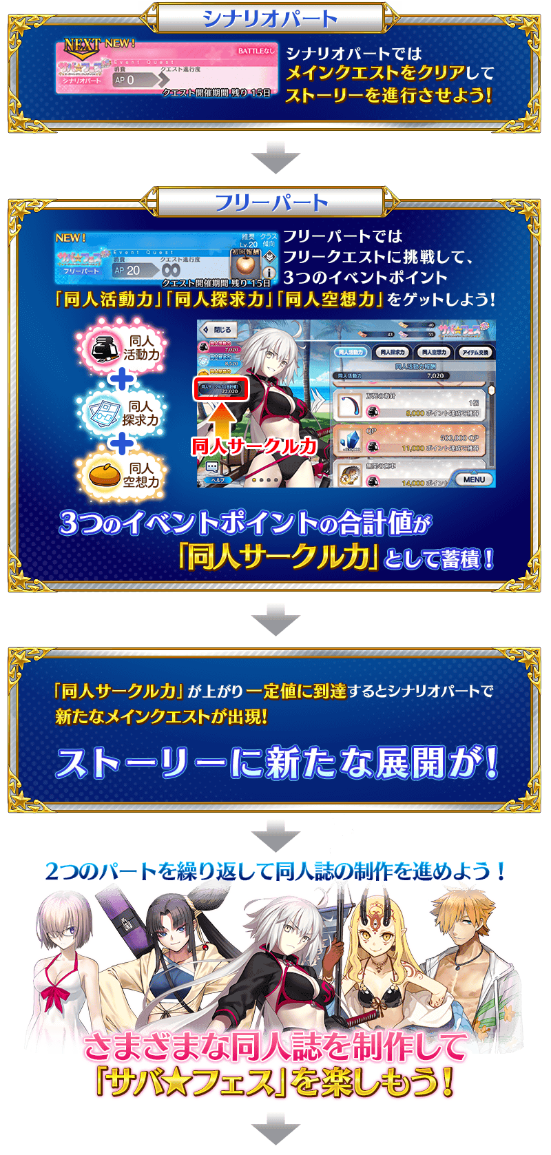 ※本ページの画像はすべて開発中のものです。実際の画像とは異なる場合があります。 ※本イベントは、2018年に開催された期間限定イベント「サーヴァント・サマー・フェスティバル!」を、遊びやすく一部を再調整した「復刻ライト版イベント」です。なお、前回開催時に一部クエストの開放順にストーリー展開上の矛盾があったため、一部のクエストの開放条件を変更しております。(7月17日(水) 18:00追記) ※視認性改善のため、「BB$札」のカラーを前回開催時から変更しております。 ※真名が明かされていないサーヴァントについては、メインレコードのクエストの進行度によってサーヴァントの名称が変化いたします。 ※一部のクエストは後日開放されます。