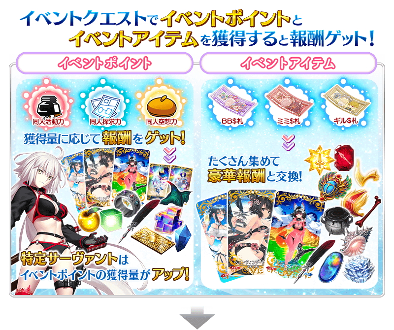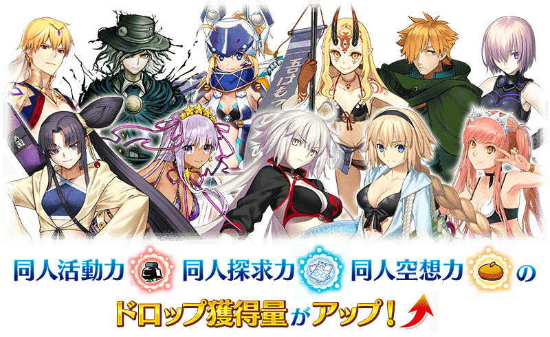 本イベントの期間中、下表のサーヴァントはイベントクエストにおいて「同人活動力、同人探求力、同人空想力のドロップ獲得量がアップ」と「絆ポイント獲得量がアップ」のボーナスが得られます!