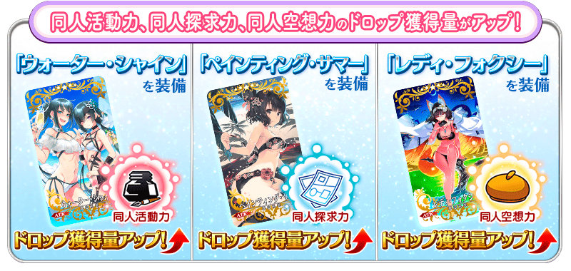 イベントアイテム交換で入手できるイベント限定概念礼装「ウォーター・シャイン」「ペインティング・サマー」「レディ・フォクシー」を装備することで、期間限定イベント「復刻:サーヴァント・サマー・フェスティバル! ライト版」のイベントクエストにおける同人活動力、同人探求力、同人空想力のドロップ獲得量がアップします。