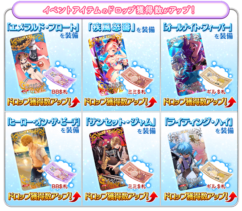 聖晶石召喚にてピックアップされる期間限定概念礼装「エメラルド・フロート」「疾風怒濤」「オールナイト・フィーバー」「ヒーロー・オン・ザ・ビーチ」「サンセット・ジャム」「ライティング・ハイ」を装備することで、イベントアイテム「BB$札」「ミミ$札」「ギル$札」それぞれのドロップ獲得数がアップします。