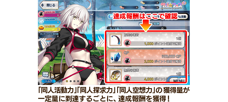 「同人活動力」「同人探求力」「同人空想力」の獲得量が一定量に到達するごとに、達成報酬を獲得できます。