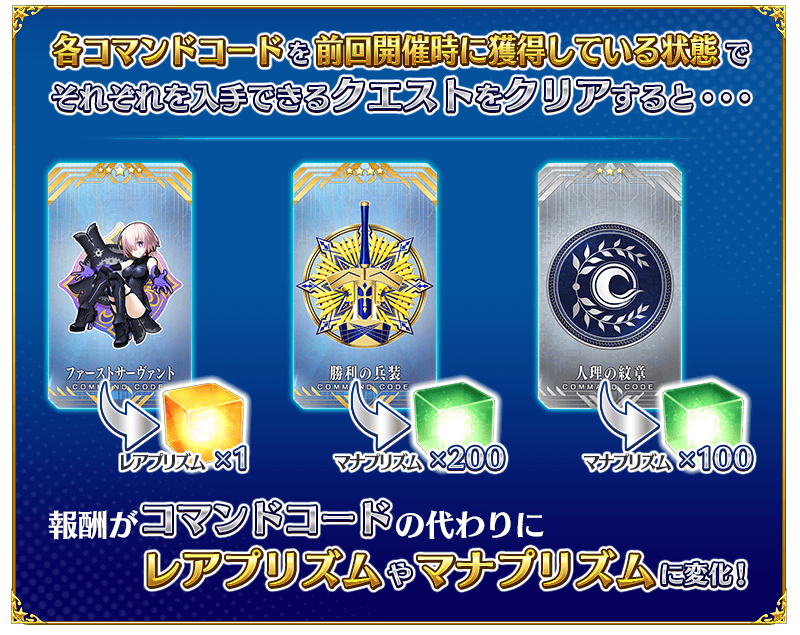 なお、2018年8月に開催された期間限定イベント「サーヴァント・サマー・フェスティバル!」で同じコマンドコードを獲得済みの場合は、コマンドコードの代わりにレアプリズムやマナプリズムを獲得できます。 ※期間限定イベント「サーヴァント・サマー・フェスティバル!」で獲得済みの各コマンドコードを霊基変還(売却)で失っている場合でも、期間限定イベント「復刻:サーヴァント・サマー・フェスティバル! ライト版」での報酬はレアプリズムやマナプリズムに変化します。