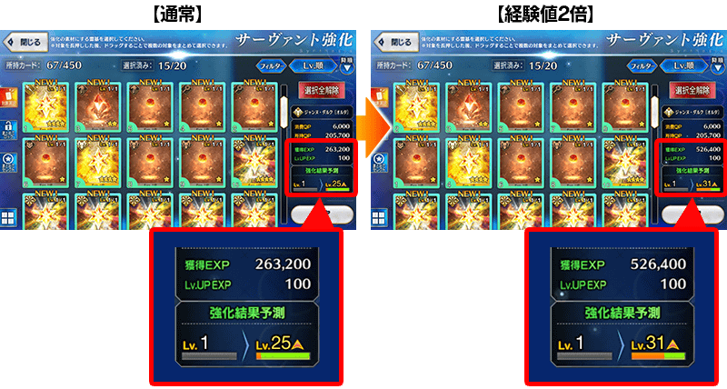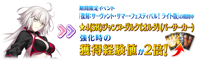 本イベントの期間中は、「★4(SR)ジャンヌ・ダルク〔オルタ〕(バーサーカー)」を強化した際の獲得経験値が2倍になります。