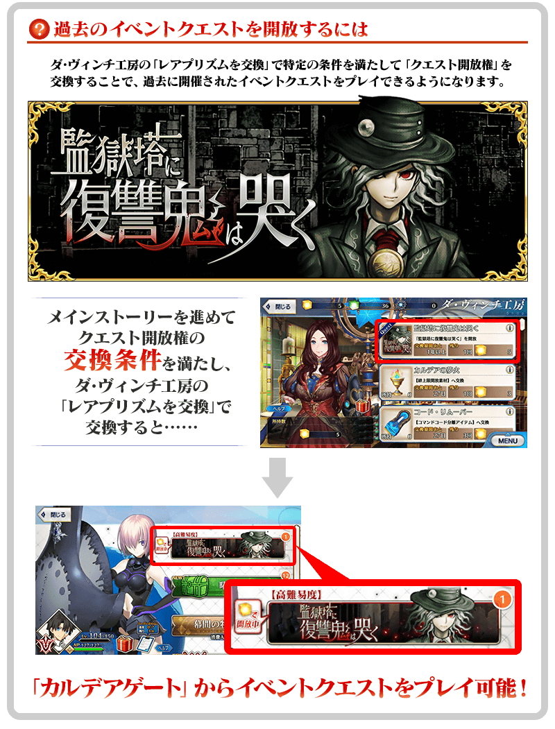 ダ・ヴィンチ工房の「レアプリズムを交換」に、期間限定で開催された上級者を対象とした高難易度のイベント「監獄塔に復讐鬼は哭く」のクエスト開放権を追加いたします。
