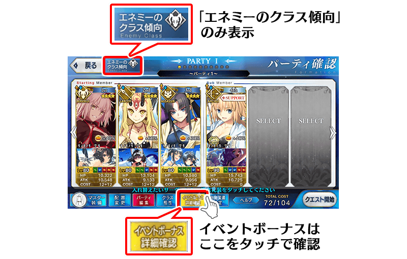 パーティ編成画面上部に「エネミーのクラス傾向」を常時表示させるように改修いたします。