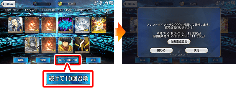 ※フレンドポイント召喚で、続けて10回召喚をするためのフレンドポイントが不足している場合は、残りのフレンドポイントで召喚できる最大回数を続けて召喚できます。