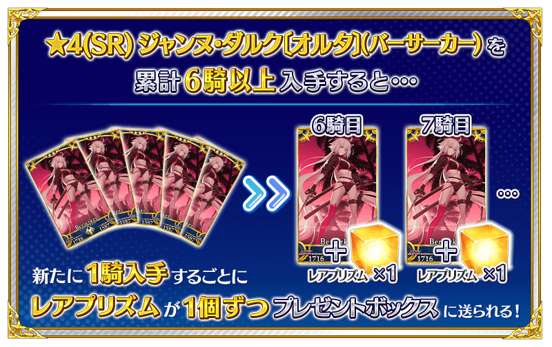 「★4(SR)ジャンヌ・ダルク〔オルタ〕(バーサーカー)」を「累計で6騎以上」入手すると、6騎目以降、新たに1騎入手するごとにレアプリズム1個がプレゼントボックスに送られます。