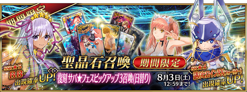 ※「★5(SSR)BB」「★4(SR)女王メイヴ(セイバー)」「★4(SR)謎のヒロインXX(フォーリナー)」はピックアップ期間終了後、ストーリー召喚には追加されません。