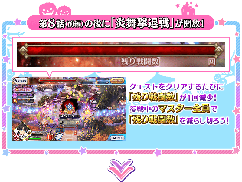 「残り戦闘数」はすべてのマスターで共有しており、マスター全員で炎舞撃退戦を何度もクリアして、「残り戦闘数」を0回にすればエネミーを撃退することが可能です。