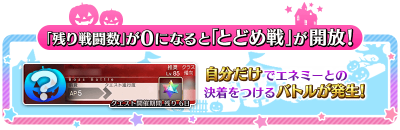 「残り戦闘数」が0回になった後は「とどめ戦」というクエストが発生し、ストーリーを先に進めることができます。