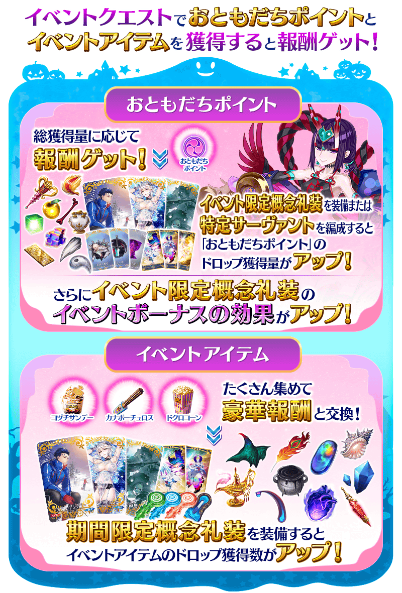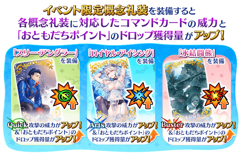 これらのイベント限定概念礼装を装備することで、各概念礼装に対応したコマンドカードの威力と「おともだちポイント」のドロップ獲得量がアップします。