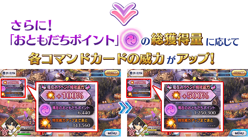 さらに、このイベント限定概念礼装の「コマンドカードの威力がアップ」の効果は、「おともだちポイント」の総獲得量が一定値を超えるごとに強化されていきます。