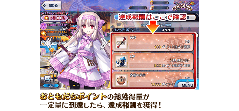 「おともだちポイント」の総獲得量が一定量に到達するごとに、達成報酬を獲得できます。