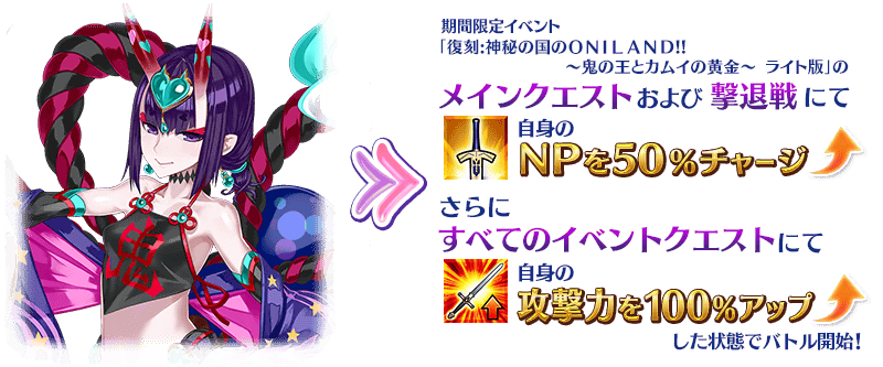 「★4(SR)酒呑童子(キャスター)」は、本イベントのメインクエストおよび撃退戦にて、自身のNPを50%チャージした状態でバトルを開始できます。