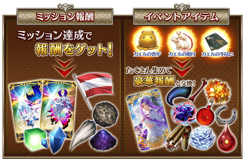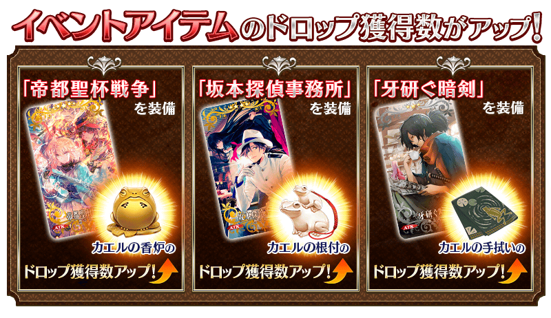 聖晶石召喚にてピックアップされる期間限定概念礼装「帝都聖杯戦争」「坂本探偵事務所」「牙研ぐ暗剣」を装備することで、イベントアイテム「カエルの香炉」「カエルの根付」「カエルの手拭い」それぞれのドロップ獲得数がアップします。