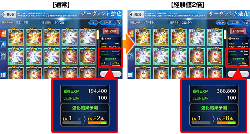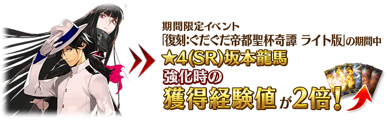 本イベントの期間中は、「★4(SR)坂本龍馬」を強化した際の獲得経験値が2倍になります。