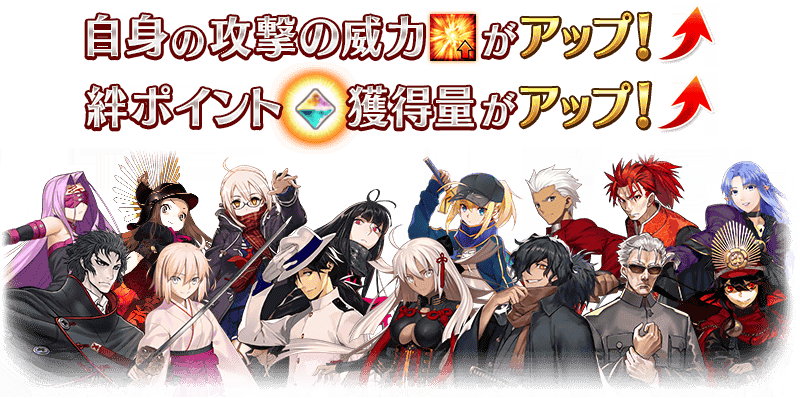 本イベントの期間中、下表のサーヴァントはイベントクエストにおいて「自身の攻撃の威力がアップ」と「絆ポイント獲得量がアップ」のボーナスが得られます!