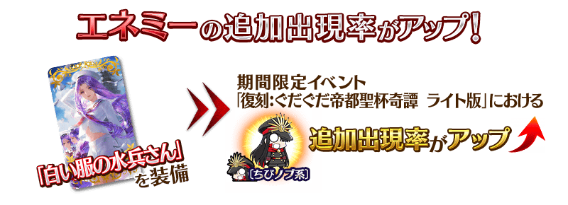 ミッション報酬やイベントアイテム交換で入手できるイベント限定概念礼装「白い服の水兵さん」を装備することで、〔ちびノブ系〕エネミーの追加出現率がアップします。