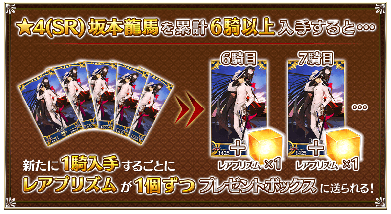「★4(SR)坂本龍馬」を「累計で6騎以上」入手すると、6騎目以降、新たに1騎入手するごとにレアプリズム1個がプレゼントボックスに送られます。