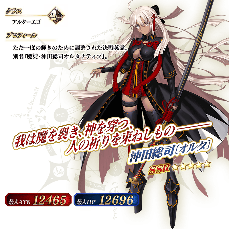 ※上記の「★5(SSR)沖田総司〔オルタ〕」のイラストは霊基再臨第2段階のものです。
