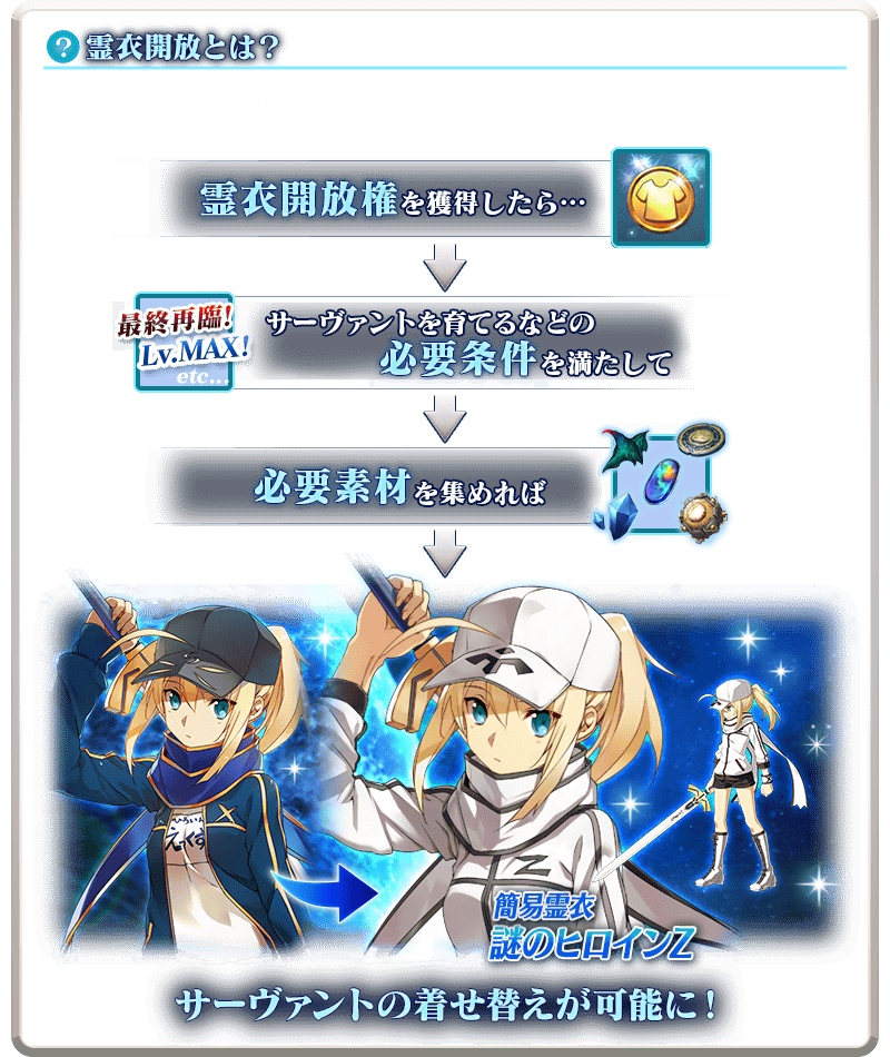 ※「霊衣開放」後は自動でバトルキャラやアイコンが切り替わります。「霊衣開放」前の状態に戻したい場合や、他の再臨段階に変更したい場合は、サーヴァント詳細画面より変更することができます。 ※ボイスは「霊衣開放」前の状態と同じものになります。 ※「霊衣開放」による変更はサーヴァントの外見のみで、クラスやパラメータなどに変化はありません。