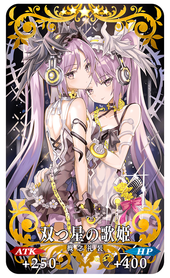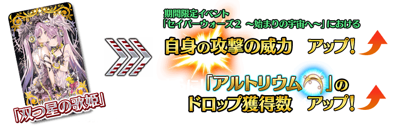 イベントアイテム交換で入手できるイベント限定概念礼装「双つ星の歌姫」を装備することで、期間限定イベント「セイバーウォーズ2 ~始まりの宇宙へ~」のイベントクエストにおける自身の攻撃の威力がアップします。