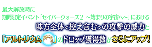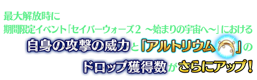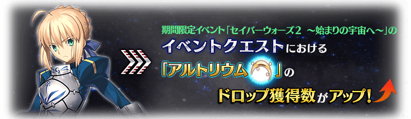本イベントの期間中、「★5(SSR)アルトリア・ペンドラゴン(セイバー)」は、イベントクエストにおけるイベントアイテム「アルトリウム」の「ドロップ獲得数がアップ」のボーナスが得られます。