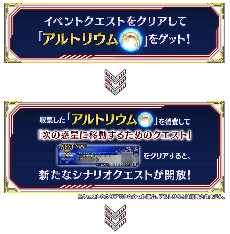 ※簡易霊衣「謎のヒロインZ」開放権は、本イベントのメインクエストをクリア後に交換可能になります。(10月30日(水) 21:30追記) ※英霊結晶・流星のフォウくんALL★4(HP)、英霊結晶・日輪のフォウくんALL★4(ATK)については、本イベントのメインクエストをクリア後に交換可能になります。 ※「アルトリウム」はイベント期間終了後にQPへ交換できます。 ※イベントアイテム交換期間終了後「金のセイバーバッヂ」「銀のセイバーバッヂ」「銅のセイバーバッヂ」「アルトリウム」は消滅します。 ※「賞金首の手配書」はイベント終了後の2019年11月13日(水) 12:59に消滅します。