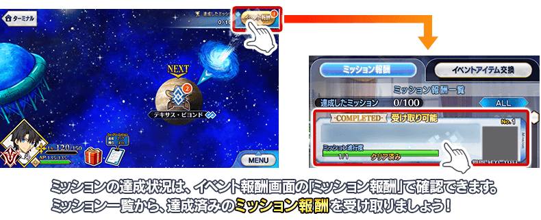 ※クリア条件を満たしただけでは、報酬は獲得できませんのでご注意ください。 ※ミッション報酬を受け取らないと、新たなミッションなどが開放されないことがありますのでご注意ください。