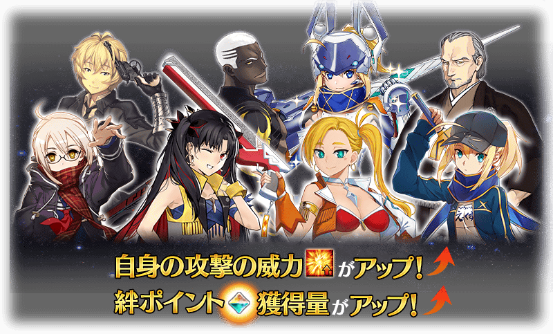 本イベントの期間中、下表のサーヴァントはイベントクエストにおいて「自身の攻撃の威力がアップ」と「絆ポイント獲得量がアップ」のボーナスが得られます。対象のサーヴァントを強化して、イベントに挑みましょう!
