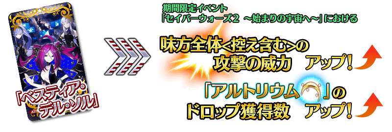 また、イベントミッション報酬で入手できるイベント限定概念礼装「ベスティア・デル・ソル」を装備することで、期間限定イベント「セイバーウォーズ2 ~始まりの宇宙へ~」のイベントクエストにおける味方全体<控え含む>の攻撃の威力がアップします。
