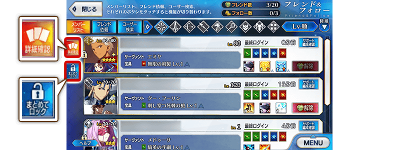 「詳細確認」では、これまで同様、フレンドまたはフォローのサーヴァントと概念礼装の詳細を確認することが可能です。