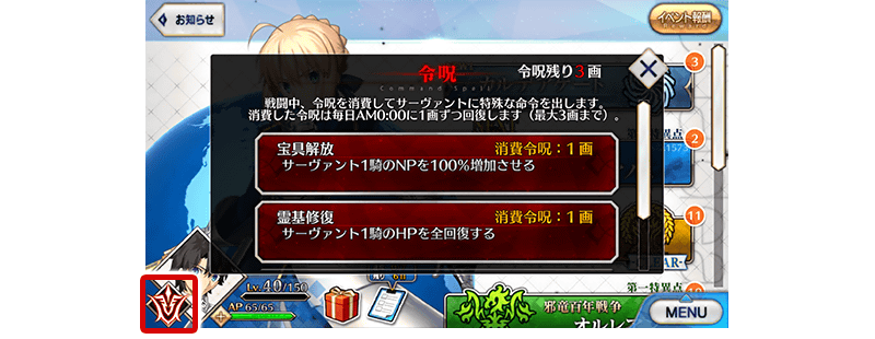 ターミナル画面およびマップ画面において令呪アイコンをタッチした際に令呪ウィンドウを出すように変更