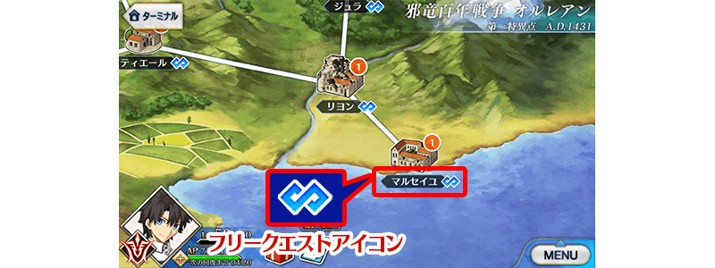 該当のスポットにフリークエストが存在する場合、スポット名にフリークエストがあることを示すアイコンが表示されるようになります。