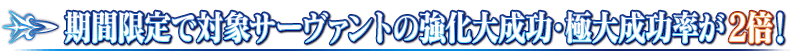 下記の期間中、ドラマCD「Fate/Prototype 蒼銀のフラグメンツ」関連サーヴァントの強化をおこなった際に、大成功(経験値2倍ボーナス)・極大成功(経験値3倍ボーナス)の発生率が期間限定で2倍になります!