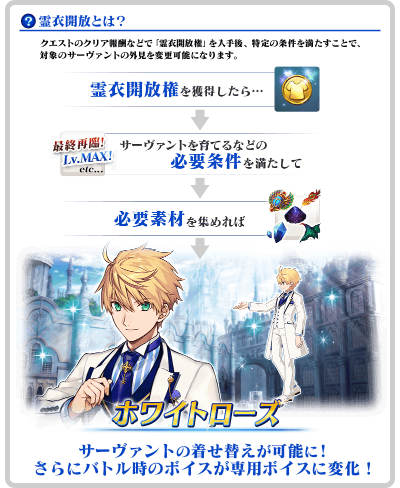 ※「霊衣開放」後は自動でバトルキャラやアイコンが切り替わります。「霊衣開放」前の状態に戻したい場合や、他の再臨段階に変更したい場合は、サーヴァント詳細画面より変更することができます。 ※「霊衣開放」による変更はサーヴァントの外見やボイスのみで、クラスやパラメータなどに変化はありません。 ※一部のボイスは変化しませんのでご注意ください。