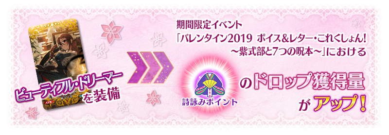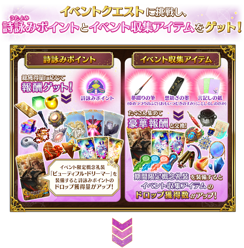 イベントアイテム交換で入手できるイベント限定概念礼装「ビューティフル・ドリーマー」を装備することで、詩詠みポイントのドロップ獲得量がアップします。