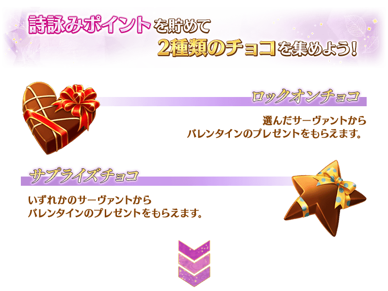 イベントクエストに挑戦して「詩詠みポイント」を集め、イベント交換アイテム「ロックオンチョコ」「サプライズチョコ」を入手し、意中のサーヴァントからバレンタインのプレゼントをもらいましょう!