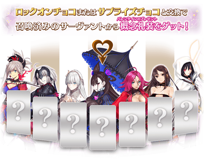 ※「ロックオンチョコ」「サプライズチョコ」をわたしてバレンタインのプレゼントを受け取ることのできるサーヴァントは、召喚履歴のあるサーヴァントのみとなります。