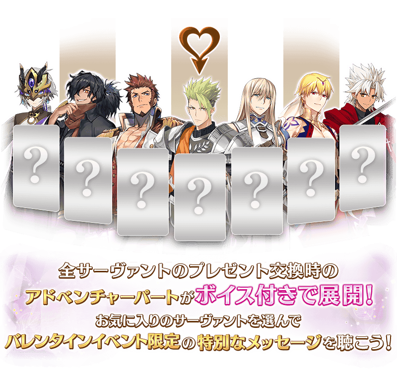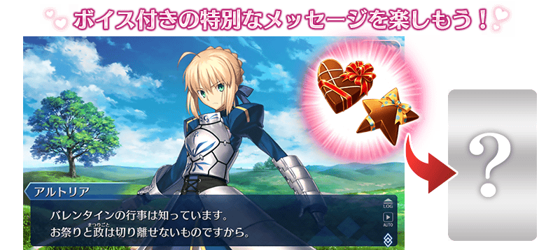 ※ボイスが付くのは本イベントで発生するプレゼント(概念礼装)をもらうイベントのみとなり、マイルームの「マテリアル」にて閲覧できる2018年までのバレンタインイベントのものはボイスは付きませんのでご注意ください。
