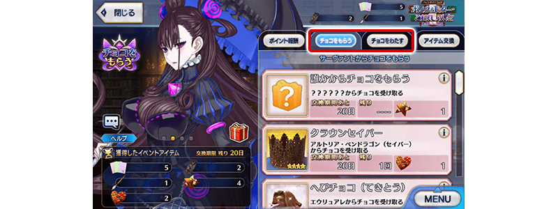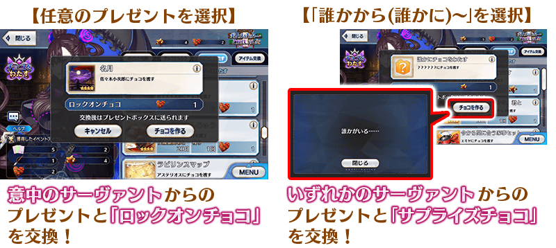 イベントアイテム交換で「チョコをもらう」を選択するとおもに女性サーヴァントから、「チョコをわたす」を選択するとおもに男性サーヴァントからバレンタインのプレゼントがもらえます。