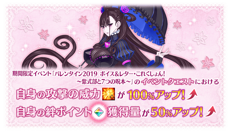 初登場となるサーヴァント「紫式部」は、期間限定イベント「バレンタイン2019 ボイス&レター・これくしょん!~紫式部と7つの呪本~」のイベントクエストにおける自身の攻撃の威力が100%アップおよびクエストクリア時に得られる自身の絆ポイント獲得量が50%アップのボーナスを得られます!