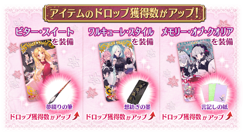 聖晶石召喚にてピックアップされる期間限定概念礼装「ビター・スイート」「ワルキューレ・スタイル」「メモリー・オブ・クオリア」を装備することで、イベント収集アイテム「夢綴りの筆」「想紡ぎの墨」「言記しの紙」それぞれのドロップ獲得数がアップします。