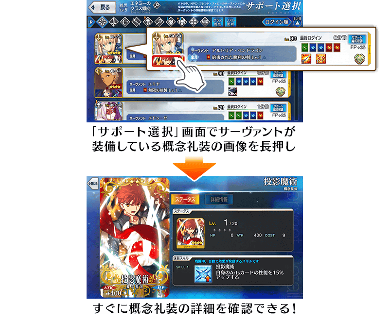 「サポート選択」画面でサーヴァントが装備している概念礼装の詳細を確認可能に!