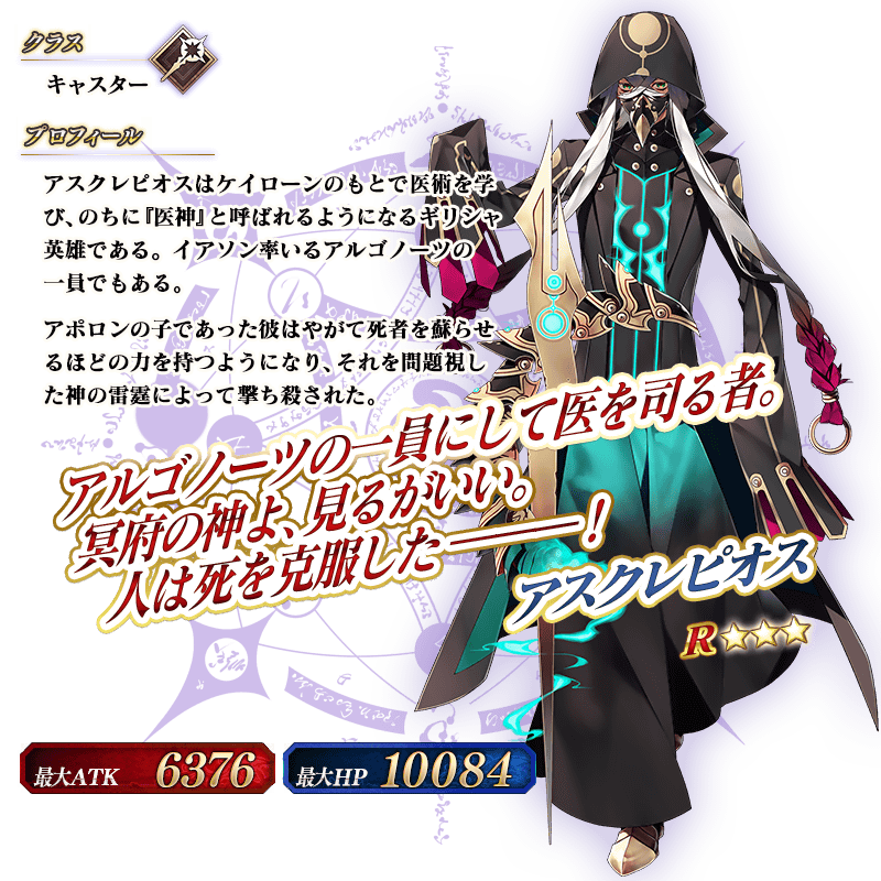 ※「★4(SR)アシュヴァッターマン」「★3(R)アスクレピオス」は2019年6月22日(土) 18:00より、Lostbelt No.4クリア後にストーリー召喚に追加されるサーヴァントです。