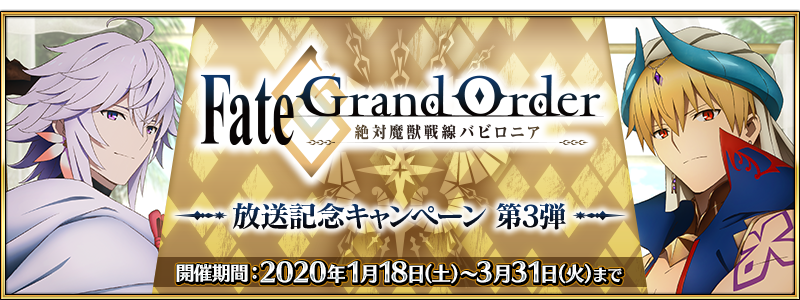 TVアニメ「Fate/Grand Order -絶対魔獣戦線バビロニア-」の放送を記念して『TVアニメ「Fate/Grand Order -絶対魔獣戦線バビロニア-」放送記念キャンペーン 第3弾』を2020年1月18日(土) 18:00(予定)より開催することを発表いたしました。