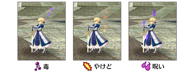 バトル中の状態効果を把握しやすくなるように、「毒」「やけど」「呪い」の状態効果を示す演出を効果ターン中常にバトルキャラクター周辺に表示するように改修いたします。